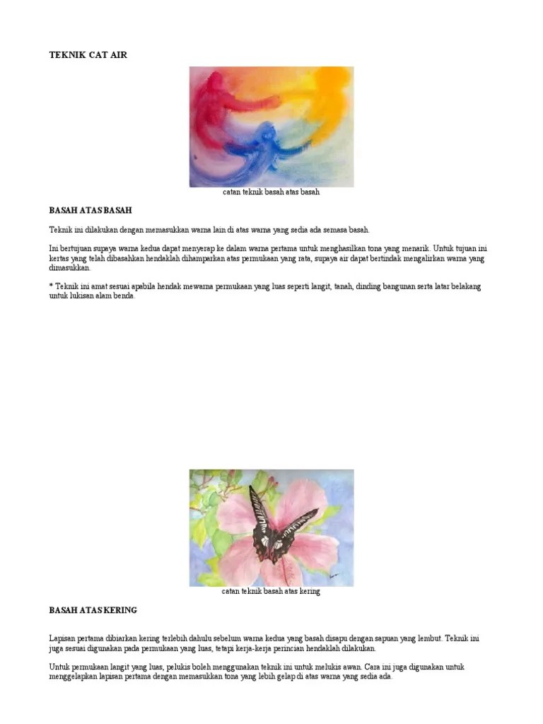 Mengapakah cat fresko sesuai digunakan untuk lukisan dinding? Media kering seperti pensel arang serta kapur dan dilukis di atas permukaan kertas. Cara melukis dengan teknik tempera. Catan teknik basah atas kering1. Teknik basah atas kering merupakan warna yang disapu tanpa campuran air atau campuran air yang sedikit di . Seni dalam pendidikan teknik cat air .